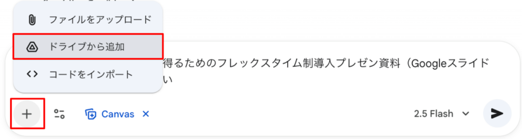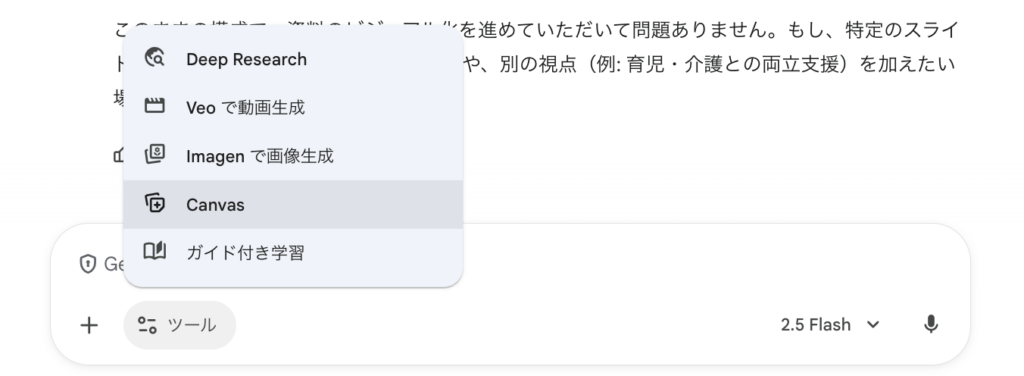 Geminiのプロンプト入力箇所下部の「ツール」より「Canvas」を呼び出します。