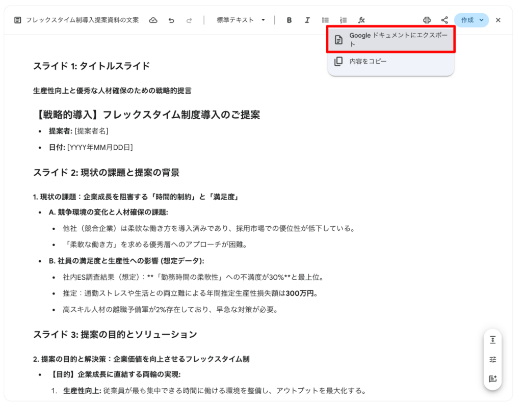 また、Canvasの内容は「Googleドキュメント」として出力が可能です!