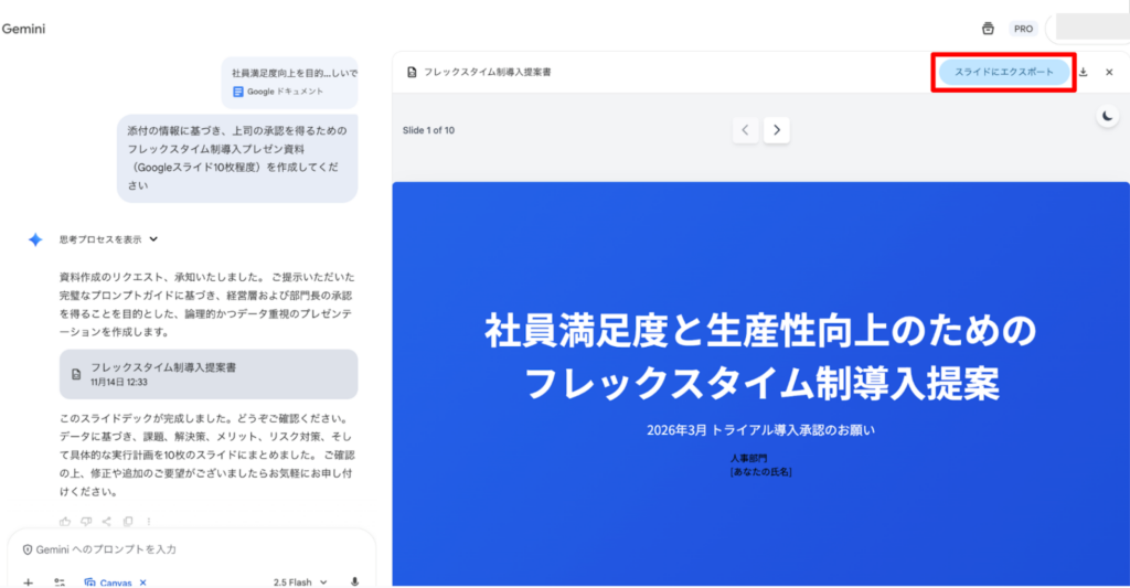 このように、「完璧なプロンプトを自分で考えて作ってもらう」のではなく、「どうすればいいか?」を相談すると、「自分の考え+Geminiの意見」で、より「誰にでも響きやすい」資料に作り上げることができます。