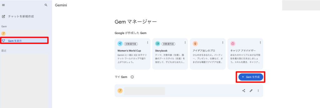 ② 左メニュー内「 Gem を表示」を開き、「+ Gem を作成」をクリック
