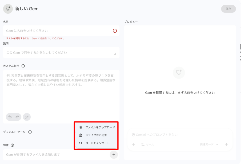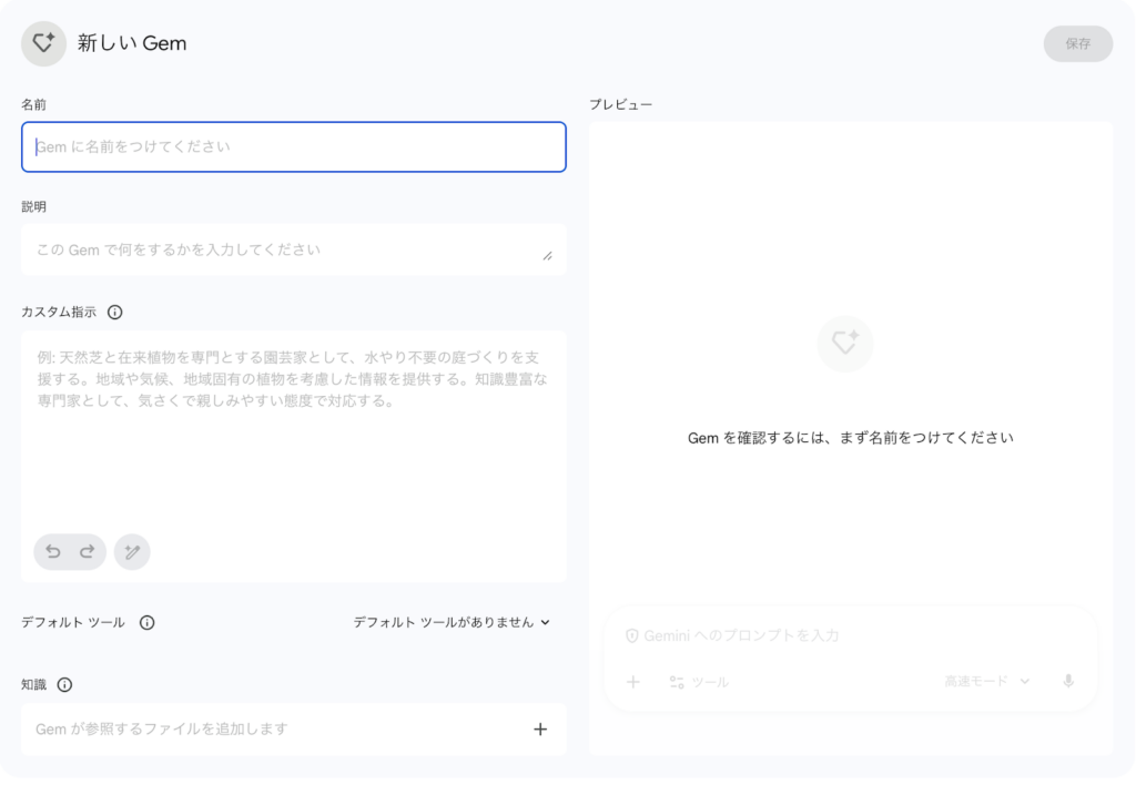 ③ 「新しい Gem 」の作成画面が表示されるため「名前」「説明」「カスタム指示」「知識」を設定する