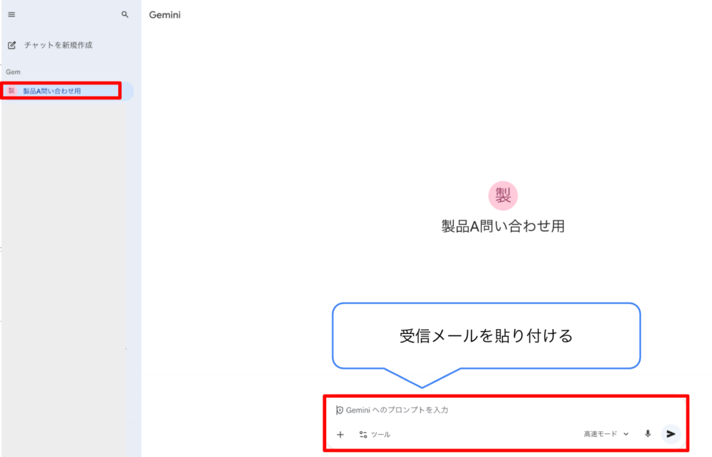 左メニュー「 Gem 」より利用したいものを呼び出し、「プロンプトを入力」欄に受信した問い合わせメールを添付すると、返信文案が作成されます。