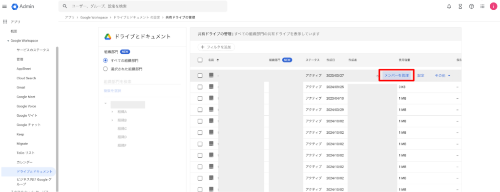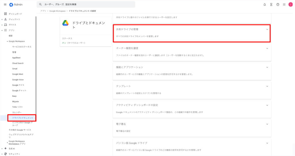 ② 左メニュー「アプリ>Google Workspace>ドライブとドキュメント」内の「共有ドライブの管理」をクリックする