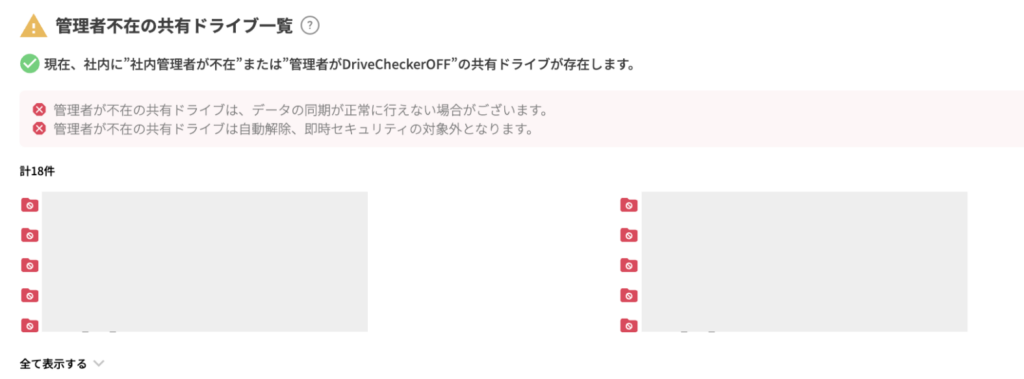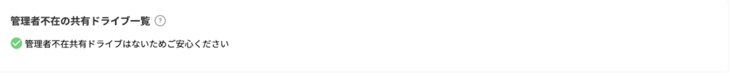 DribeCheckerは、ログインし最初に表示されるダッシュボード内にて「管理者不在の共有ドライブ」を確認することができます。