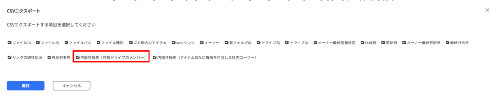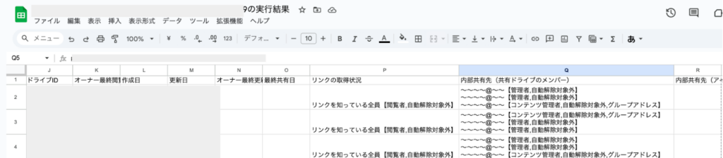 出力情報内に「内部共有先(共有ドライブのメンバー)」があるため、こちらで管理者以外の権限情報を確認することも可能です。
